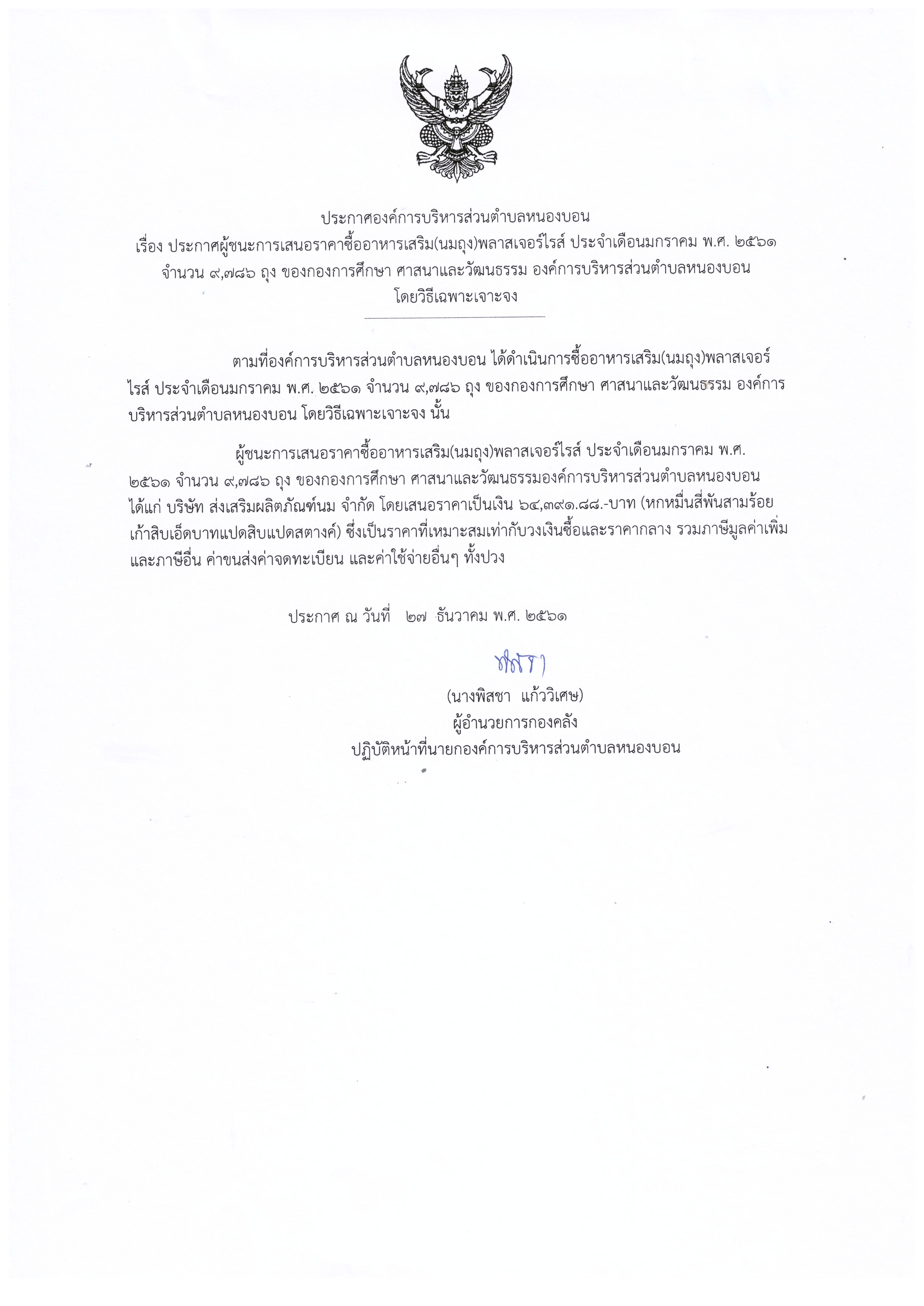 ประกาศผู้ชนะการเสนอราคาซื้ออาหารเสริม(นมถุง)พลาสเจอร์ไรส์ ประจำเดือนมกราคม ๒๕๖๒ จำนวน ๙,๗๘๖ ถุง ของกองการศึกษาศาสนาและวัฒนธรรมลงข่าว: 27/12/2561