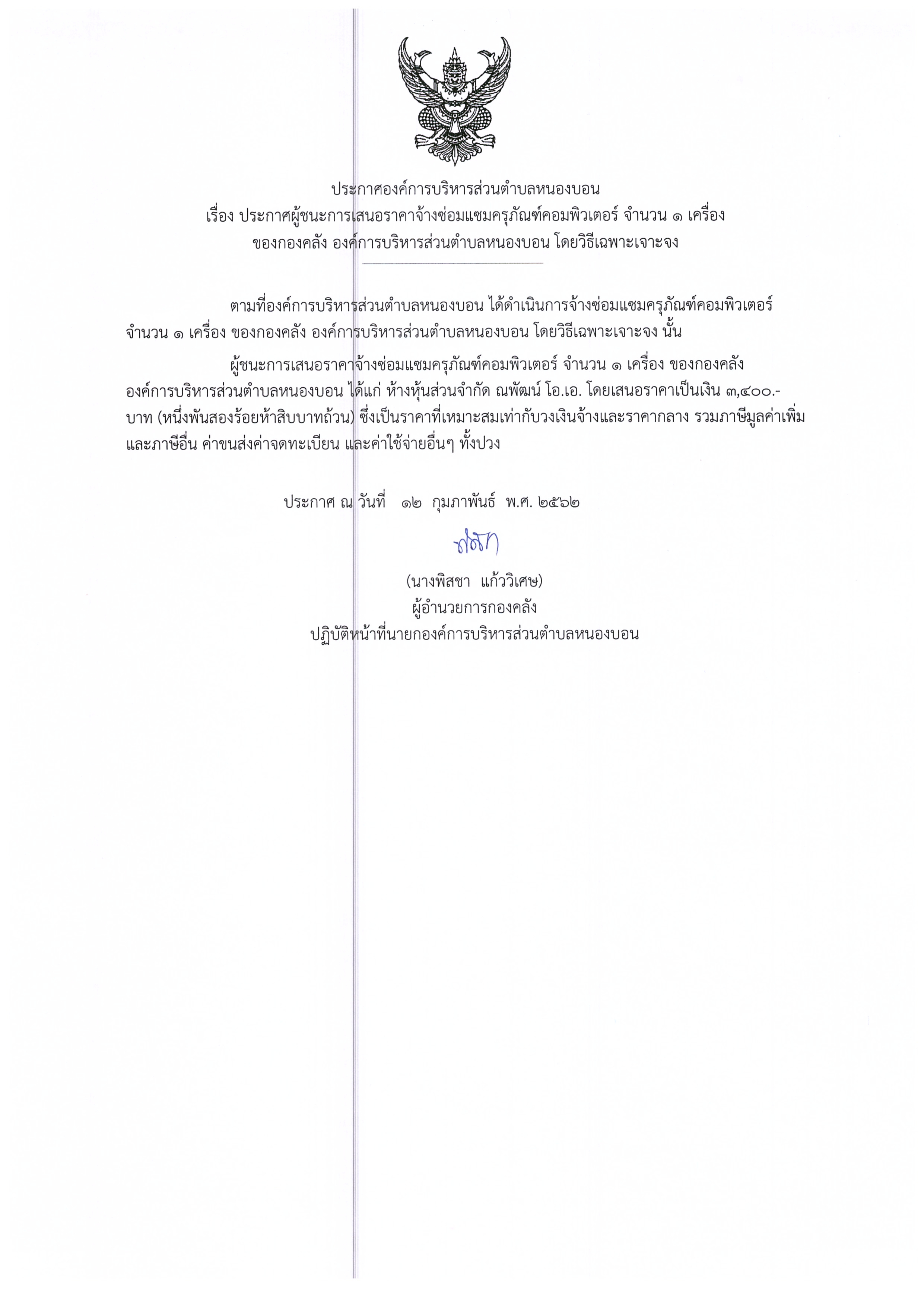 ประกาศผู้ชนะการเสนอราคาจ้างซ่อมแซมครุภัณฑ์คอมพิวเตอร์ จำนวน 1 เครื่อง ของกองคลัง องค์การบริหารส่วนตำบลหนองบอนลงข่าว: 12/02/2562