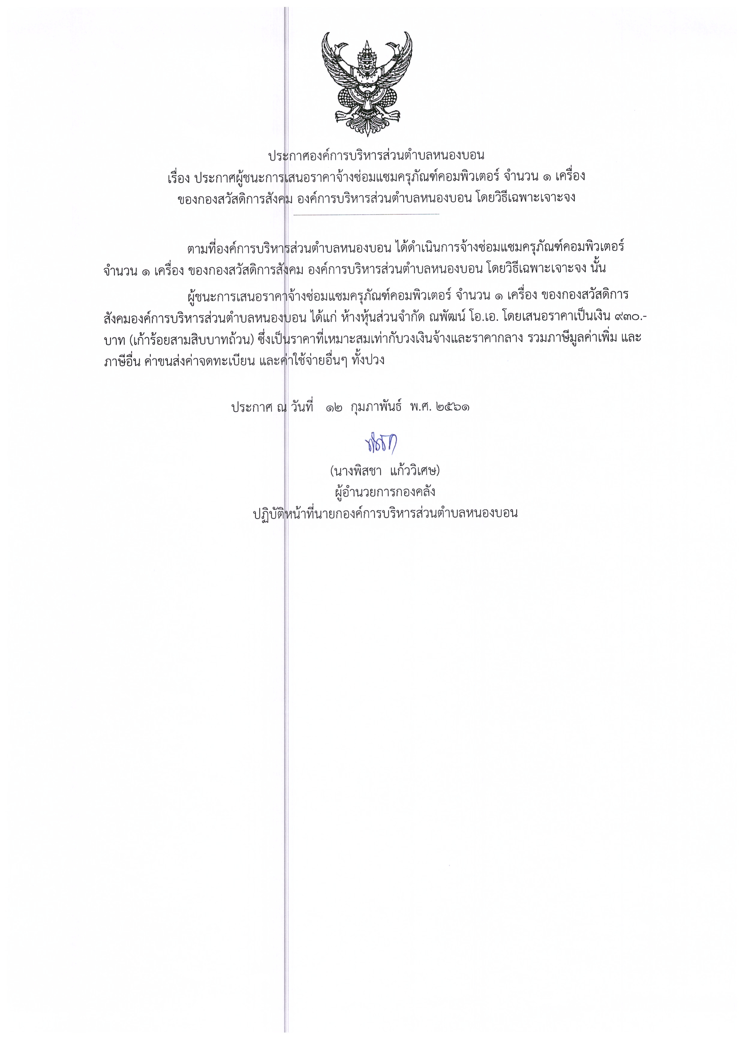 ประกาศผู้ชนะการเสนอราคาจ้างซ่อมแซมครุภัณฑ์คอมพิวเตอร์ จำนวน 1 เครื่อง ของกองสวัสดิการสังคม องค์การบริหารส่วนตำบลหนองบอนลงข่าว: 12/02/2562