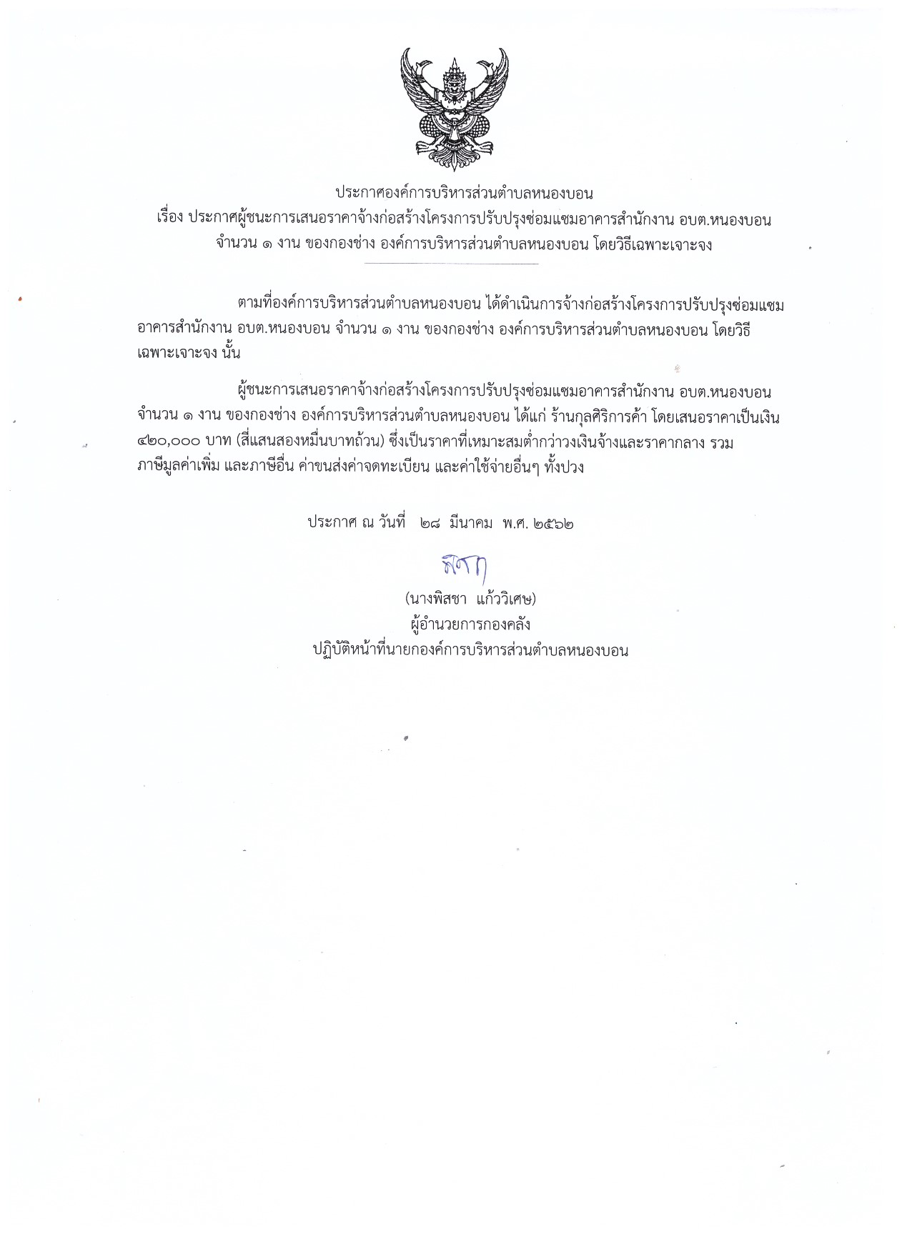ประกาศผู้ชนะการเสนอราคาจ้างก่อสร้างโครงการปรับปรุงซ่อมแซมอาคารสำนักงาน อบต.หนองบอน จำนวน 1 งาน ของกองช่าง องค์การบริหารส่วนตำบลหนองบอนลงข่าว: 28/03/2562