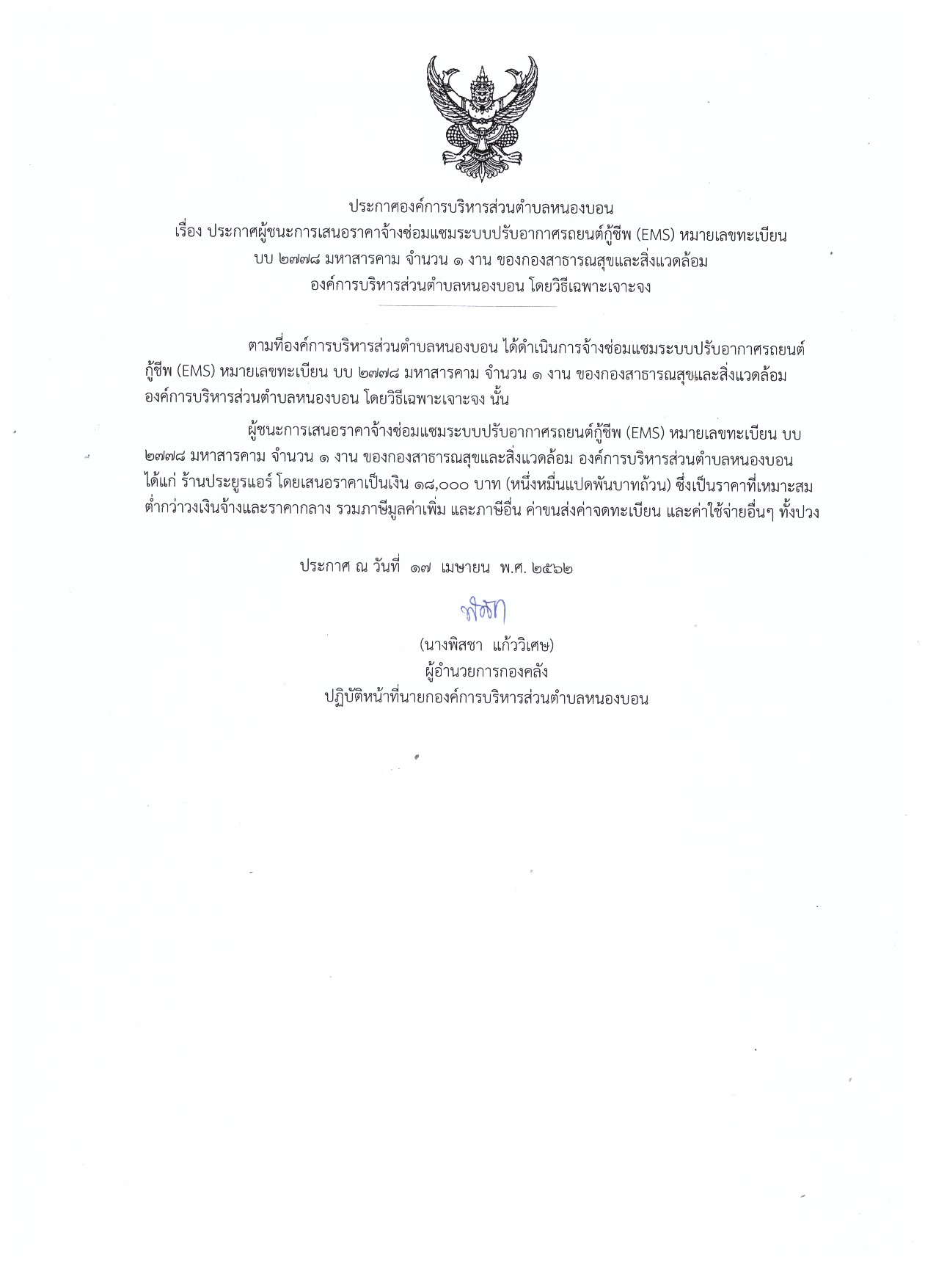 ประกาศผู้ชนะการเสนอราคาจ้างซ่อมแซมระบบปรับอากาศรถยนต์กู้ชีพ (EMS) หมายเลขทะเบียน บบ 2778 มหาสารคาม จำนวน 1 งาน ของกองสาธารณสุขและสิ่งแวดล้อม องค์การบริหารส่วนตำบลหนองบอนลงข่าว: 17/04/2562