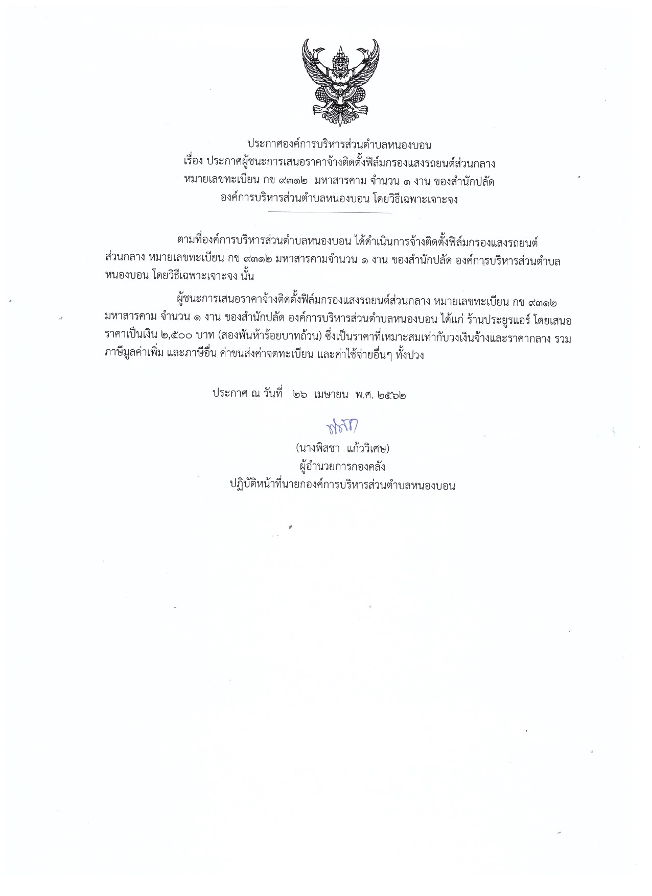 ประกาศผู้ชนะการเสนอราคาจ้างติดตั้งฟิล์มกรองแสงรถยนต์ส่วนกลาง หมายเลขทะเบียน กข 9312 มหาสารคาม จำนวน 1 งาน ของสำนักปลัด องค์การบริหารส่วนตำบลหนองบอนลงข่าว: 26/04/2562