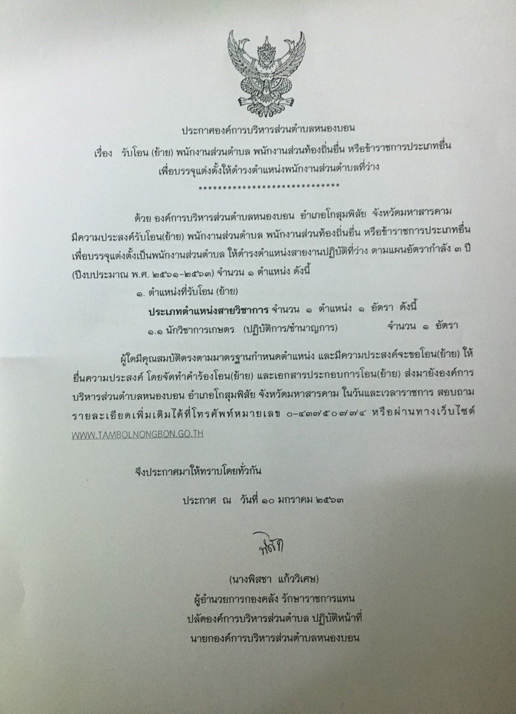 ประกาศรับโอน (ย้าย) พนักงานส่วนตำบล
